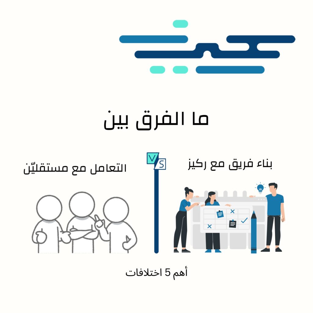 في عالم العمل الحر قد تبدو الخيارات كثيرة وسريعة، لكن ليس كل حل مؤقت مناسبًا لبناء فريق عمل متكامل أو لمشروع طويل الأمد. فيما يلي نستعرض أبرز الفروق بين التعامل مع المستقلين وبين بناء فريق مع ركيز: