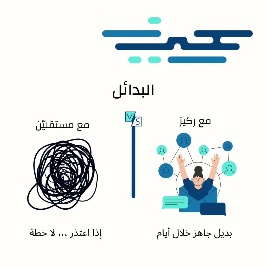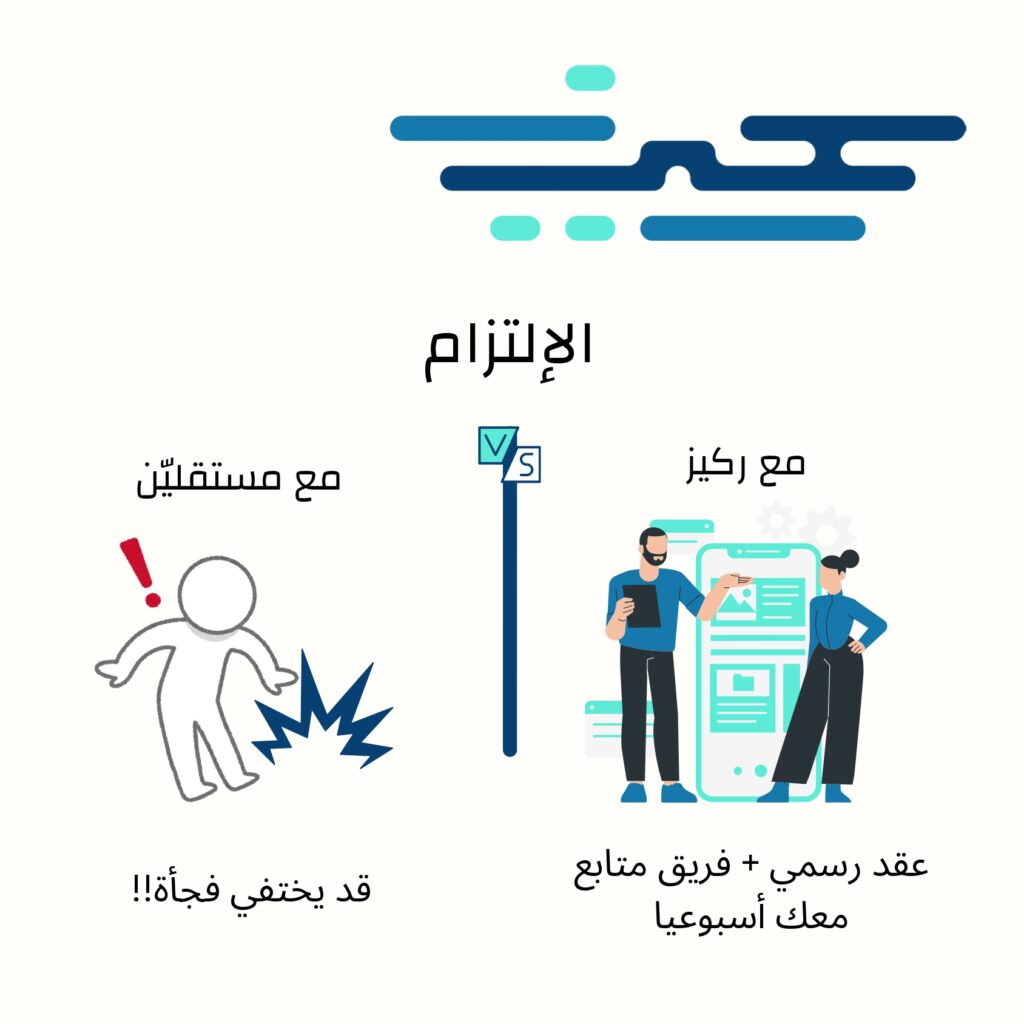 العمل مع المستقلين قد يكون حلًا مؤقتًا، لكنه يحمل الكثير من المخاطر على الالتزام والجودة والاستمرارية. أما مع ركيز، فأنت تتعامل مع شريك موثوق يضمن لك الالتزام، والجودة، والإدارة الكاملة، مع بدائل سريعة تحفظ استقرار مشروعك على المدى الطويل. 🚀