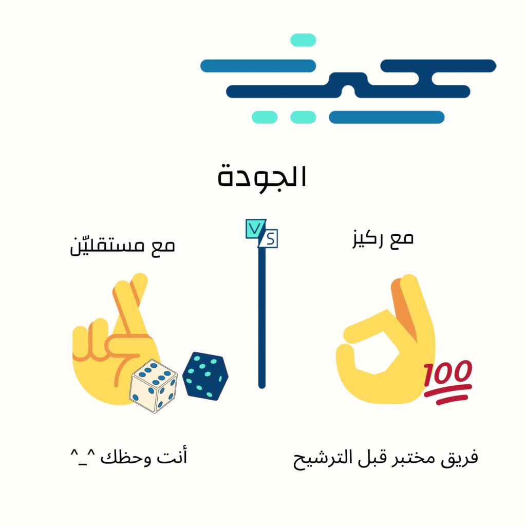 بينما في ركيز، يتم ترشيح فريق مدرَّب ومختبر مسبقًا، ما يضمن جودة الأداء منذ البداية.
